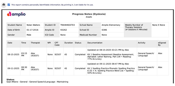 Progress Notes provide a session-by-session record for an individual student, including therapist, duration, CPT code, documentation, and activity details. This report is useful for IEP meetings, compliance documentation, and supervision reviews.