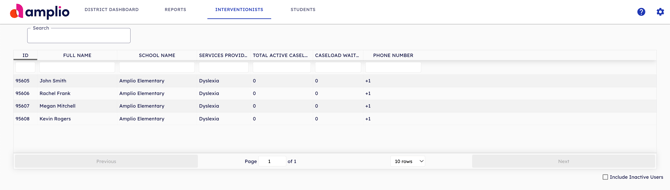 The Interventionists tab gives you a searchable list of all interventionists in your district, along with a summary of their caseload status.